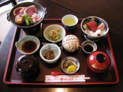 また、夜の宴会では神山の食材を活かした会席料理をご用意しております。強い生命力があるとされる神山産の食材は、まさにこの地ならではの味わいです。地産地消を心がけた四季の里の逸品をどうぞお楽しみください。
