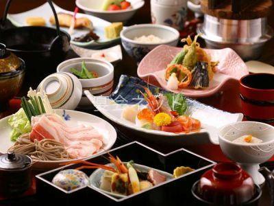 お食事には、鹿児島名物 黒豚・黒牛・黒薩摩鶏をそれぞれ違う調理法でお召し上がりいただく、肉のうま味がたまらないお料理をお出しいたします。お肉料理以外にも、錦江湾の新鮮な魚など、旬の食材を使った、見た目も華やかな薩摩ならではの懐石料理をお楽しみいただけます。