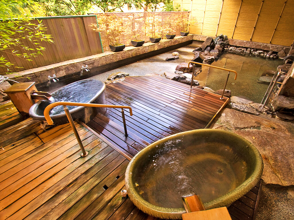 お風呂は、1300年もの長い歴史を経てなお涸れることのない粟津温泉の源泉かけ流しのお湯をお愉しみいただけます。豊かな湯量の名湯を、趣のある石彫壁浴殿と岩露天風呂で存分にご堪能ください。